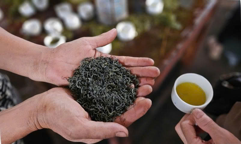 Nhúm một ít chè bằng ba ngón tay – cảm nhận độ xoăn chặt.