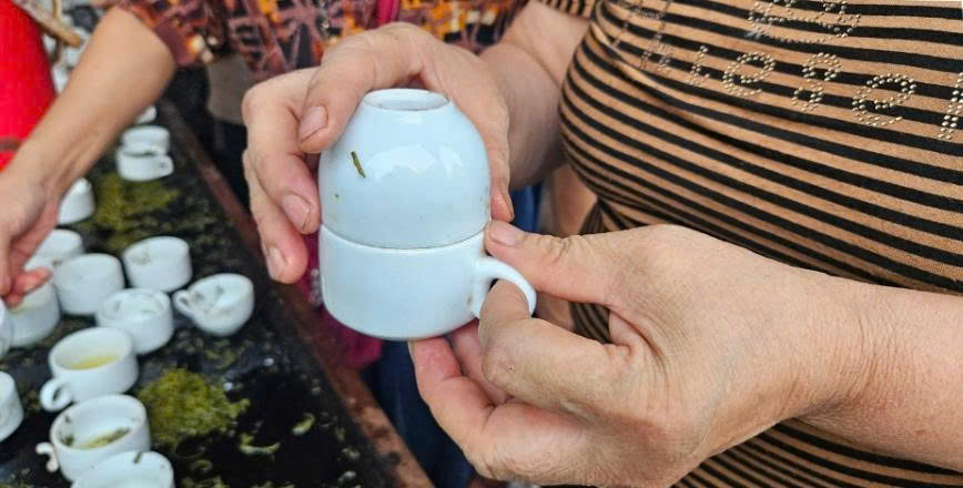 Pha thử ngay tại chỗ – chỉ cần hai chén hứng nhau và chút nước sôi.