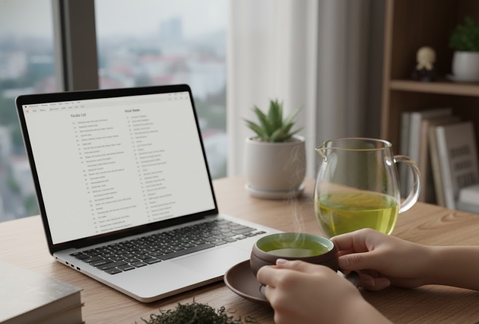Buổi sáng hôm ấy, tôi thức dậy sớm hơn thường lệ. Thành phố vẫn còn ngái ngủ, những con đường chưa kịp đông, tiếng xe hiếm hoi vang lên trong làn sương mỏng. Trên bàn làm việc, chiếc laptop mở sẵn, danh sách việc cần hoàn thành kéo dài hơn tôi mong muốn. Tôi biết mình cần tỉnh táo, rất tỉnh táo. Nhưng đồng thời, tôi cũng không muốn bắt đầu ngày mới bằng cảm giác tim đập nhanh, đầu óc căng như dây đàn – cảm giác quen thuộc mỗi khi uống một ly cà phê quá mạnh. Tôi đứng dậy, bước sang góc bếp, nơi có một gói chè Thái Nguyên vẫn được cất gọn gàng. Lá trà khô xoăn nhẹ, xanh sẫm, mang theo mùi hương rất khó gọi tên – vừa giống cỏ non, vừa phảng phất hương cốm. Tôi đun nước, chờ đến khi hơi nước bốc lên vừa đủ, không sôi ào ạt. Chén trà được rót ra, màu nước xanh ánh vàng, trong veo.